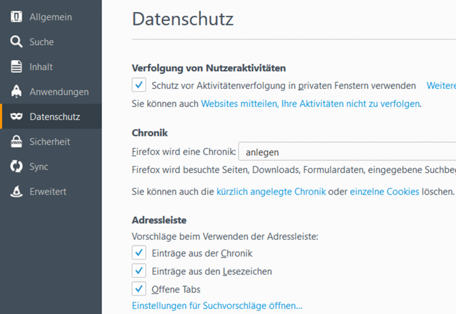 1. Klicken Sie im Firefox Menü auf "Einstellungen" und wählen Sie den Abschnitt "Datenschutz".